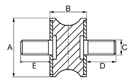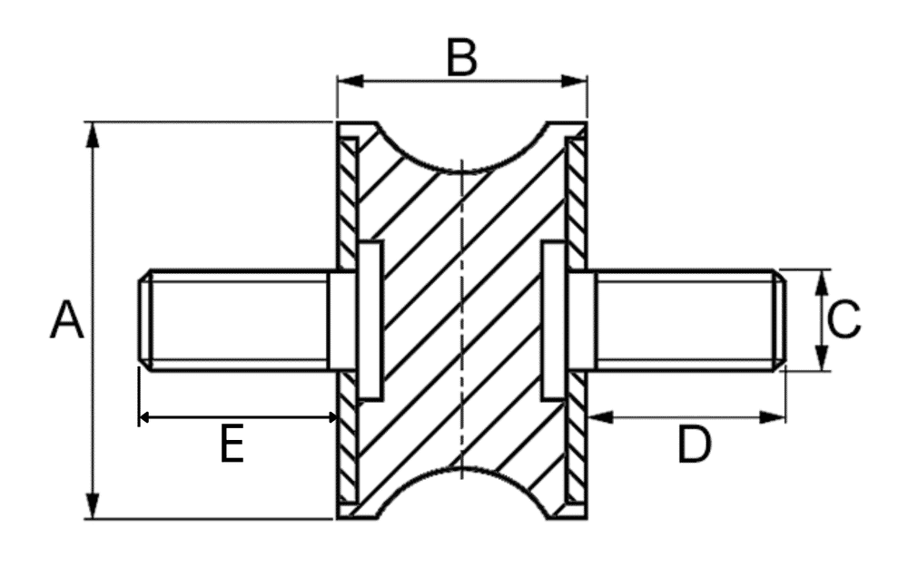 Tamponi gomma/metallo, forma sciancrata con filettatura esterna da entrambi i lati NK 55 +/-5 Shore A
