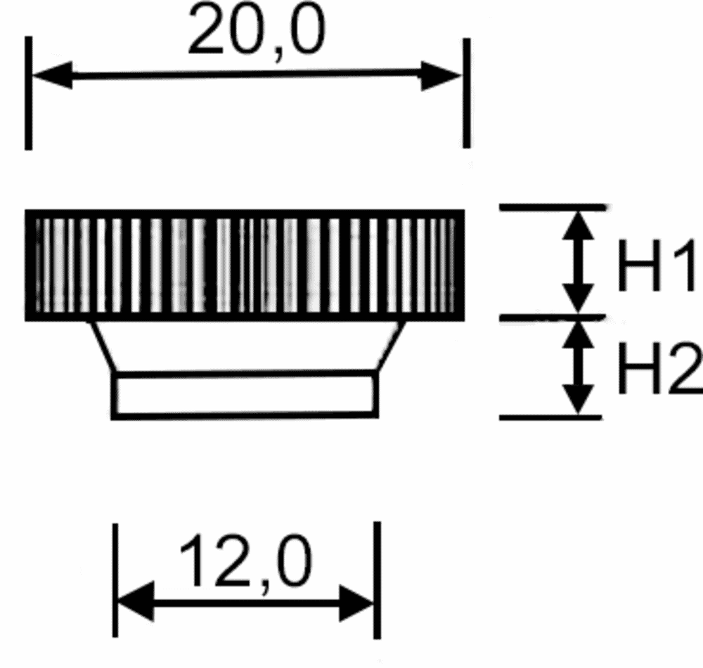 Testa in materiale plastico con zigrinatura fine e dado in acciaio, filetto passante.